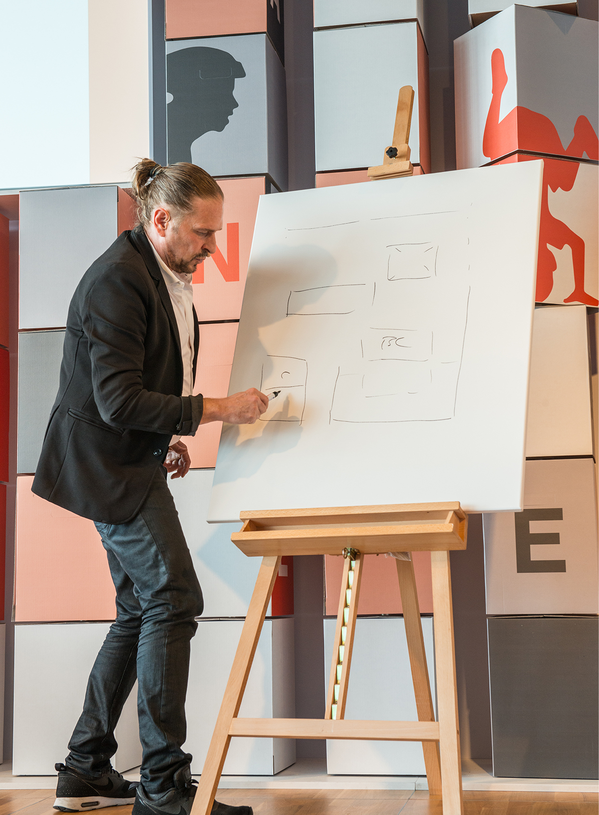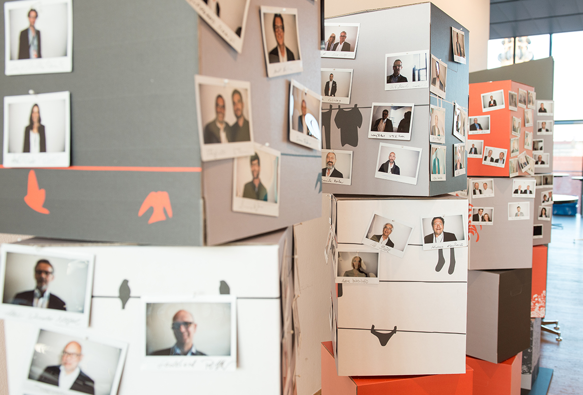 Nicht die allseits bekannte LED- bzw. Touchscreen-Ästhetik, sondern echte, für Jedermann verstehbare Lichtprojektionen zogen die Besucher magisch an. Hochmoderne Short-Throw-Beamer mit jeweils kraftvollen 20.000 Lumen machten es möglich. Und mehr als 60 kapazitive Sensoren auf der Rückseite der aufgedruckten „Schalter“ der Maschine lösten nach Berührung eine Projektion aus.