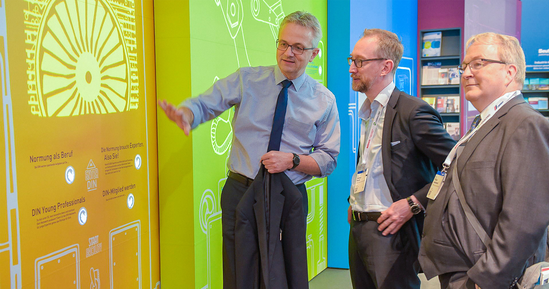 Statt üblicher LED-Displays setzte der Messestand auf interaktive Lichtprojektionen, die für jeden Besucher unmittelbar erfahrbar waren. Mit über 60 Sensoren und leistungsstarken Beamern wurde Normung spielerisch als „Fabrik der Zukunft" inszeniert